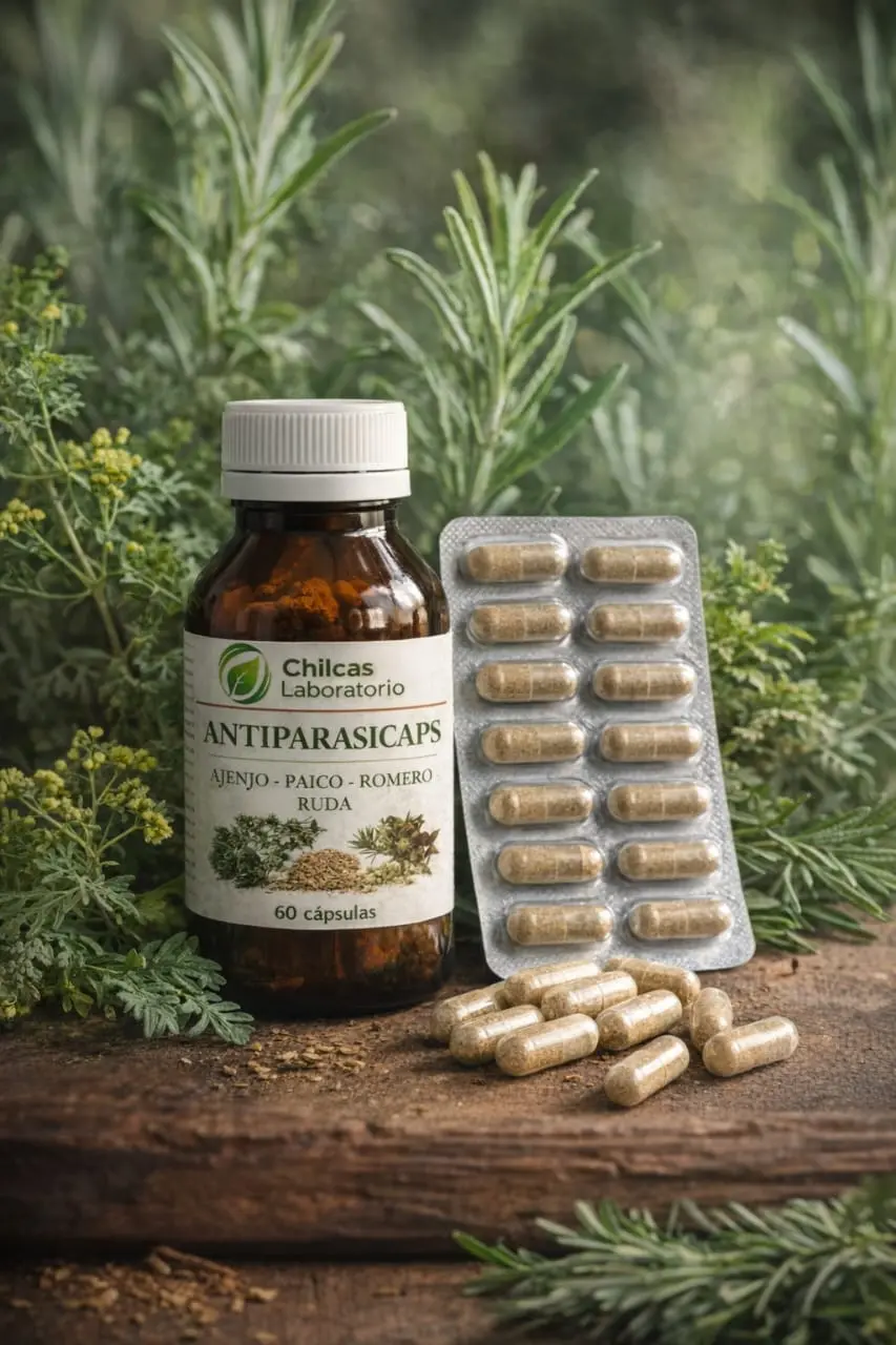 El Antiparasitario Natural combina hierbas con reconocidas propiedades depurativas y tradicionales en el cuidado del sistema digestivo. Su fórmula incluye: * Ajenjo * Paico * Romero * Ruda Estas plantas han sido utilizadas históricamente por sus propiedades anhelmínticas y de apoyo en procesos de limpieza intestinal. ✔ Favorece la depuración del intestino ✔ Contribuye al equilibrio digestivo ✔ Apoya el bienestar intestinal general ✔ Ideal para acompañar procesos de limpieza estacional Disponible en dos formatos: * Cápsulas x 60 * Extracto líquido 60cc Producto natural. Se recomienda su uso bajo orientación profesional.