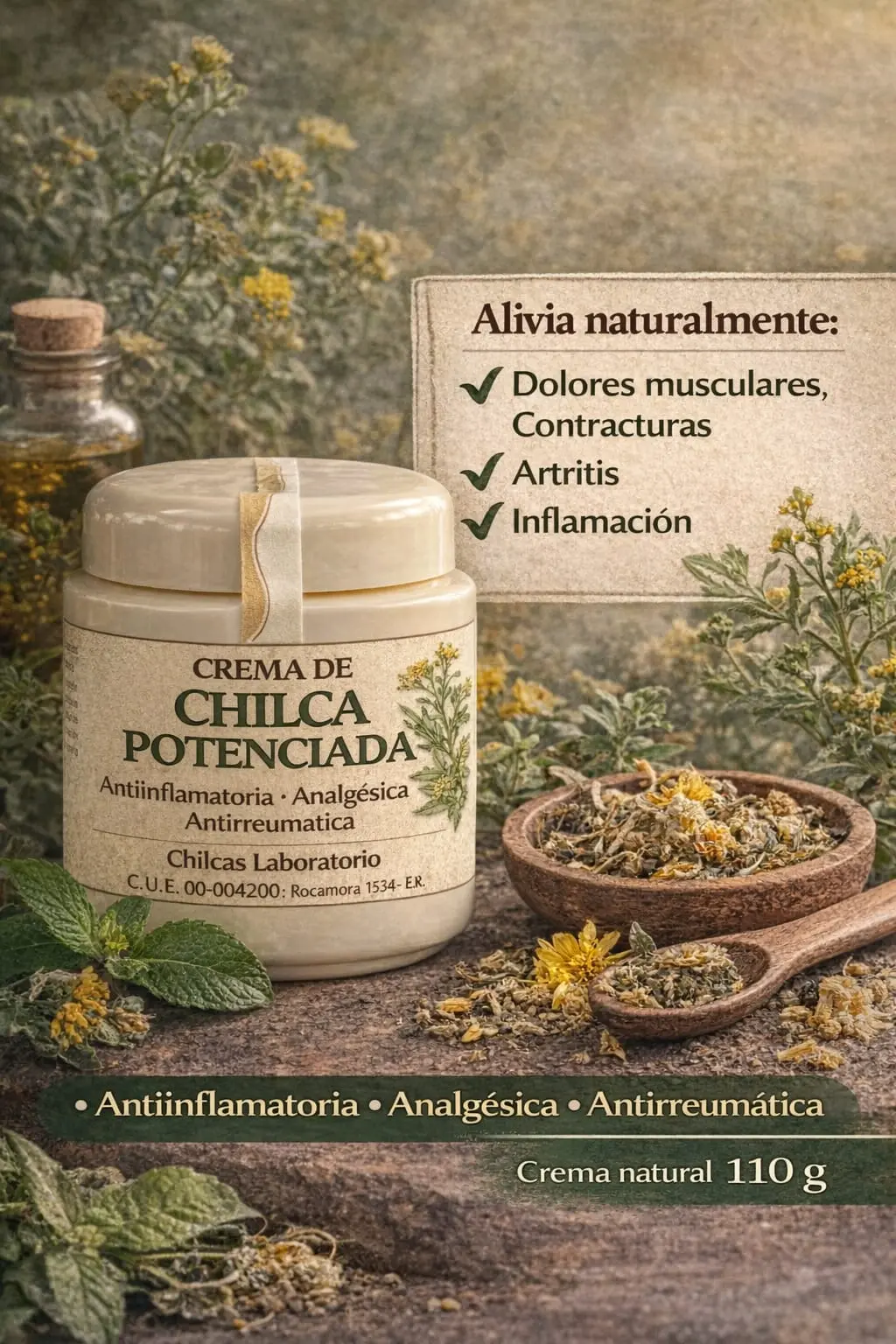 Crema elaborada con chilca potenciada, planta tradicionalmente utilizada por sus propiedades antiinflamatorias, analgésicas y antirreumáticas. Su fórmula ayuda a aliviar molestias musculares y articulares, siendo ideal para contracturas, dolores reumáticos, artritis y zonas inflamadas del cuerpo. Aplicada mediante un suave masaje, contribuye a relajar los músculos y brindar una sensación de bienestar y alivio natural.