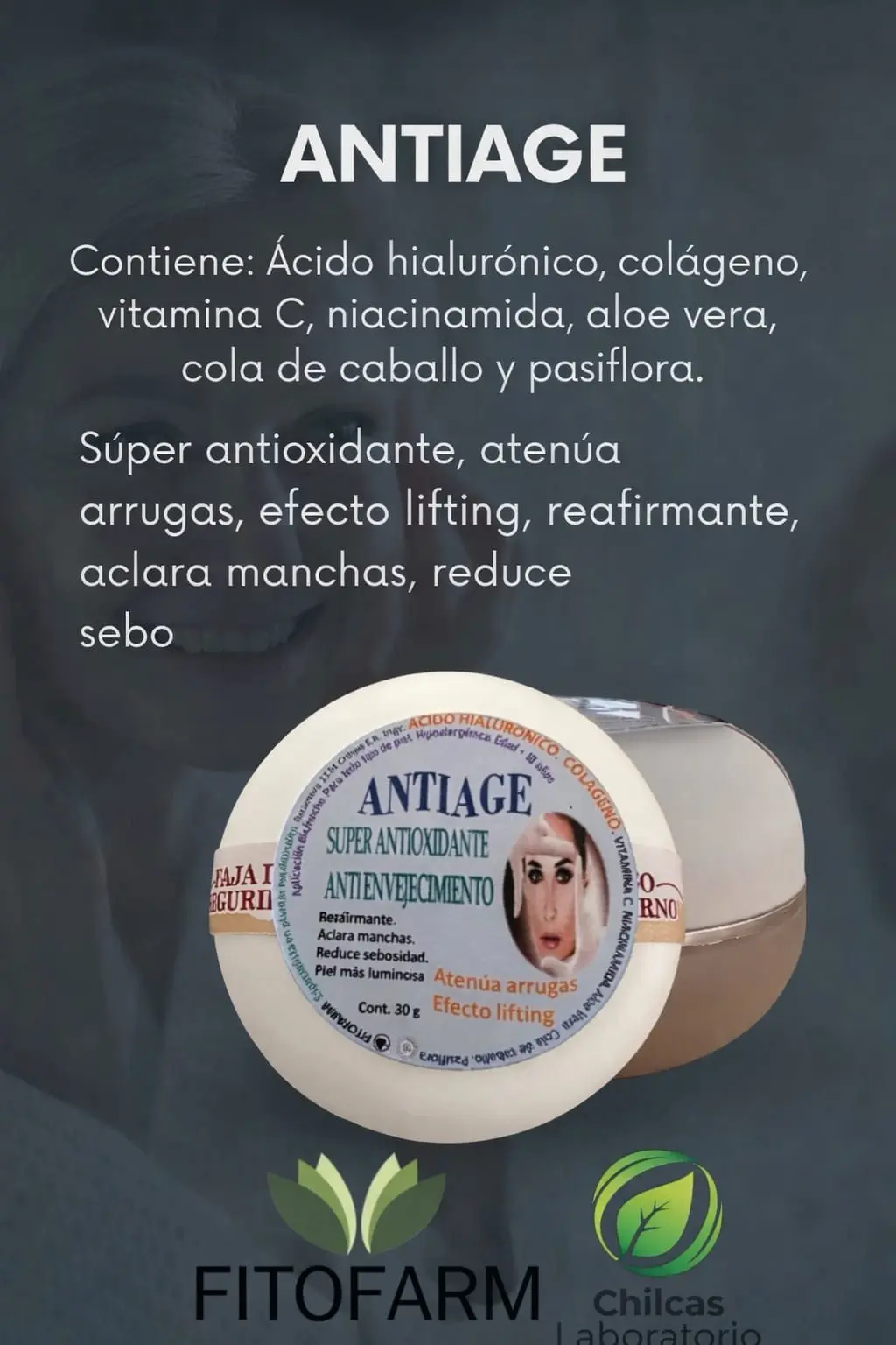 Crema anti-age para el cuidado diario del rostro formulada con una combinación de activos como ácido hialurónico, colágeno, vitamina C, niacinamida, aloe vera, cola de caballo y pasiflora. Estos ingredientes ayudan a hidratar profundamente la piel, mejorar su elasticidad y contribuir a una apariencia más firme y luminosa. Su fórmula antioxidante acompaña la rutina de cuidado facial, ayudando a suavizar líneas de expresión y a mantener la piel con un aspecto saludable y revitalizado.