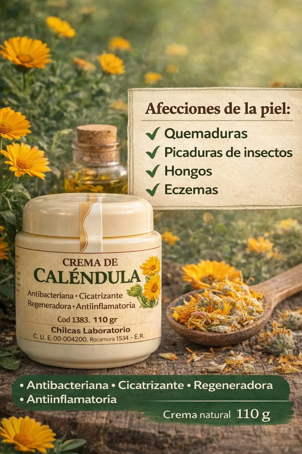Crema elaborada con extracto de caléndula, planta tradicionalmente utilizada por sus propiedades calmantes y regeneradoras para la piel. Su fórmula ayuda a proteger y cuidar la piel en casos de irritaciones, picaduras de insectos, quemaduras leves, hongos o eccemas. Además, contribuye a la regeneración cutánea, ayudando a aliviar la inflamación y mantener la piel hidratada y saludable. Ideal para incorporar al cuidado diario de la piel en toda la familia.